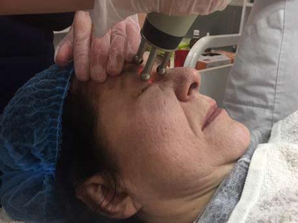 - Воздействие лазером. Перед включением прибора кожу протирают антисептиком. Глазное яблоко прикрывают защитным диском. Включают прибор, выполняют воздействие. В это время пациент может ощущать легкую боль, пощипывание, разогрев тканей. Кожа может покраснеть, слегка припухнуть.