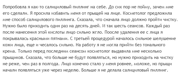 Девушки, которым не очень тщательно подбирали препарат и вид пилинга, жаловались на отсутствие желательного эффекта.