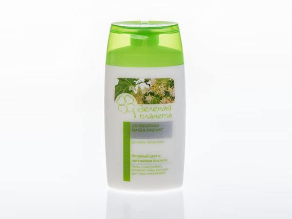Грин планет деликатная маска-пилинг предназначена для увлажнения и очищения, подходит для всех типов кожи. Освежает цвет, отбеливает пигментацию, восстанавливает гидробаланс. Обладает омолаживающими свойствами, регулярное применение позволяет достичь лифтинг эффекта. Состав включает кокосовое масло, экстракт липы, ланолин. Также содержится лимонная, гликолевая, молочная кислота, позволяющие мягко удалить ороговевший эпителий. Способ применения — нанести на чистую кожу лица, шеи, области декольте, смыть через 5–7 минут. Повторять косметический уход 1–2 раза в неделю. Производится в Российской Федерации, приобрести можно за 150 руб.