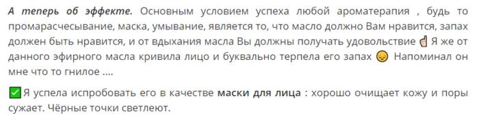 Пользователь указывает эффективность очищающей маски, успешно удаляет средство черные точки. Но неприятным показался запах эфироля.