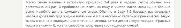 На тематических форумах, сайтах интернет-магазинов встречаются единичные мнения о вытяжке из семян малины. В комментариях к таким отзывам многие женщины пишут, что впервые слышат о таком средстве. Одна из девушек, которая поделилась опытом удачного использования малинового концентрата, отмечает, что чаще всего соединяет маслянистую жидкость с другими ингредиентами.