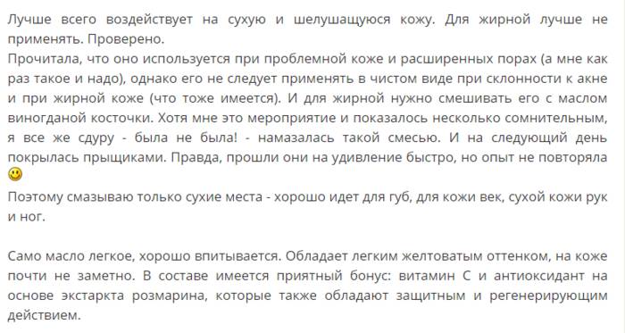 В отзыве описываются свойства масла для питания, увлажнения кожи.