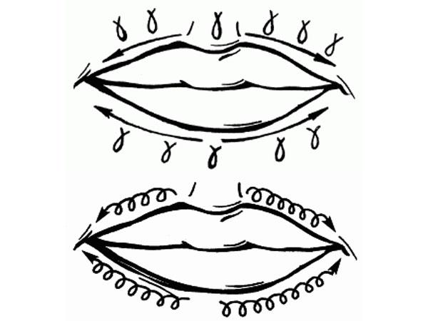 Для этого врач-косметолог устанавливает большой палец на центр губы со стороны кожи, а указательный палец — со стороны слизистой оболочки. Таким образом, он как бы захватывает губу в передне-заднем направлении. Пальцы продвигаются к уголку рта. Для массажа губ используют мягкие разминающие и прижимающие движения.