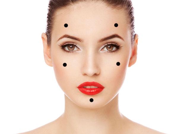 - Сначала необходимо представить на лице пять точек: в центре подбородка, на вершинах обеих щек, и сверху над бровными дугами на расстоянии в два пальца.