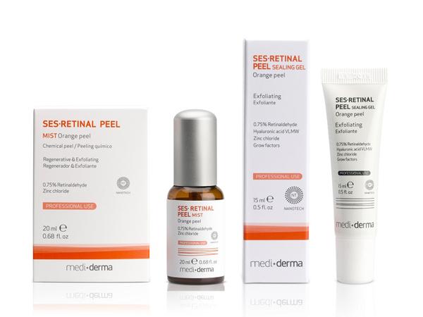 - SES-RETINAL. Линейка состоит из двух препаратов: миста (20 мл) и запечатывающего геля-эксфолианта (15 мл). Содержит ретинальдегид, который называют предшественником ретиноевой кислоты. Комплекс помогает ухаживать за жирной дермой, склонной к развитию акне. Способствует синтезу коллагена. Пилинг имеет оранжевый оттенок, поэтому после процедуры на кожу наносятся специальные защитные и тонирующие продукты. Стоимость средств: мист — около 6000 рублей, гель — 7500–8000 рублей.