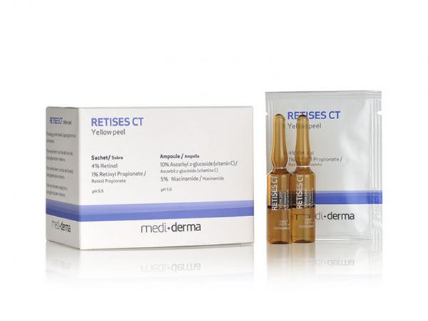 - 3 RETISES CT, он же желтый пилинг. Тоже представляет собой систему, состоящую из ампул, саше и геля-эксфолианта. В препаратах есть цинк, гиалуроновая кислота, а также ретиноловые молекулы с разной скоростью воздействия (мгновенная, отсроченная и пролонгированная). Этот пилинг на долгое время обеспечивает кожу витамином А, повышает ее защитные функции. Цена запечатывающего геля Ретисес — около 6000 рублей, а набора из 6 ампул и такого же количества саше — порядка 12 тысяч рублей.