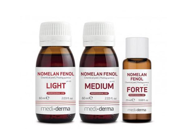 - NOMELAN FENOL. Феноловые пилинги поддерживают толщину рогового слоя дермы и борются с морщинами. В составах комбинируются разные кислоты (кофейная, миндальная, аскорбиновая и др.), а также ретинол и фенол (избирательно). Препарат NOMELAN FENOL Light справляется с поверхностными морщинами, Medium — со средними, Forte — с глубокими. NOMELAN FENOL KH отбеливает кожный покров. Объем пилингов — 60 мл (Форте — 20 мл), стоимость — от 8,5 до 17,5 тысяч рублей.