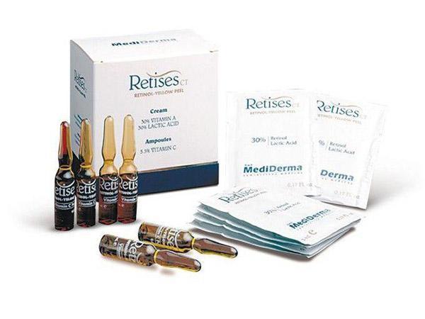 - RETISES. Желтый пилинг на основе ретинола, но без липосомированных молекул. В серии есть набор из 6 ампул и 6 саше (около 10,5 тысяч рублей), гель-эксфолиант (порядка 5000 рублей), а также кремы-пилинги: 1% и Форте 10%. Препараты питают, омолаживают и оздоравливают кожу, делают ее более гладкой и упругой.