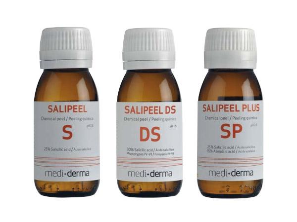 - SALIPEEL. Препараты с салициловой кислотой. В пилинге SALIPEEL S ее концентрация составляет 25%, в SALIPEEL DS — 30%. А в SALIPEEL PLUS (SP) этот компонент дополнен азелаиновой кислотой. Благодаря составу все средства оказывают на кожу противомикробное, антисептическое, противовоспалительное, омолаживающее действие. Объем любого продукта — 60 мл, стоимость — 6500–7000 рублей.