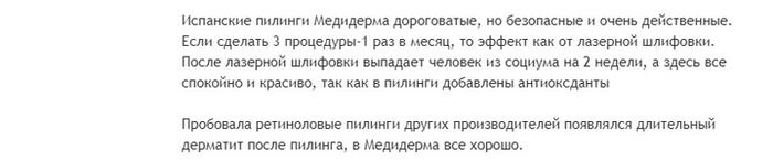 В сети встречаются единичные отзывы от женщин и девушек, которые на собственном опыте оценили эффективность разных пилингов компании Медидерма. Например, эта пациентка осталась довольна ретиноловым препаратом.
