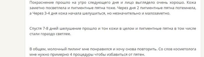 Автор этого отзыва хвалит молочный пилинг, который помогает избавиться от пигментации.
