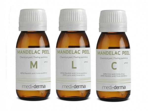 - Sesderma (серия MEDIDERMA). В испанской линии Медидерма марки Сесдерма представлены водно-спиртовые растворы для пилинга (M, L, C, T для разной глубины воздействия) и гель-эксфолиант (содержание действующего компонента 40–50%). Раствор используют без нейтрализации. В серии Mandelac также присутствуют скраб, увлажняющий гель, крем, сыворотка с низким содержанием кислоты для регулярного ухода за покровами. Стоимость жидкой формы миндального пилинга начинается от 7 тыс. руб. за 60 мл, геля — от 11 тыс. руб. за 100 мл.