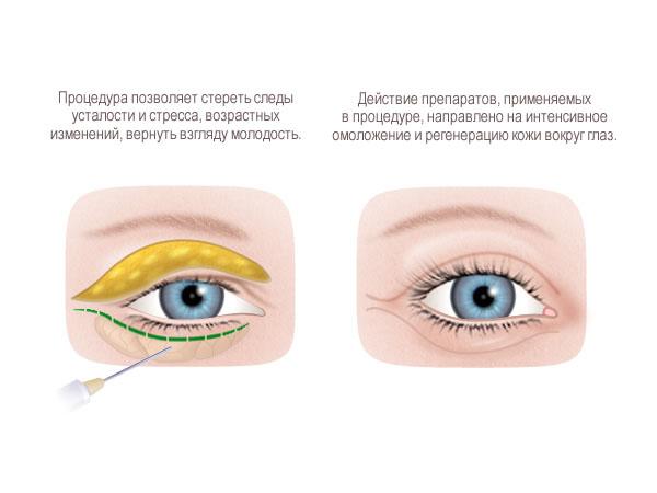 Вмешательство помогает сделать глаза эстетичнее, моложе. Манипуляции возвращают взгляду свежесть. Инъекционную блефаропластику признают достойной альтернативой инвазивному вмешательству для пациенток молодого, среднего возраста. Дамам преклонных лет с ярко выраженными изменениями нехирургическая коррекция не поможет устранить существующие проблемы. Поможет только классическая пластика.