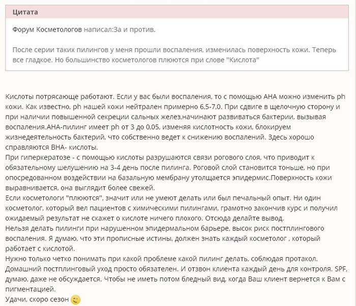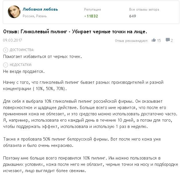 Результат пилинга в первую очередь зависит от концентрации кислоты (процентов). С его помощью можно омолодить кожу или избавиться от черных точек, как это делает следующий пользователь: