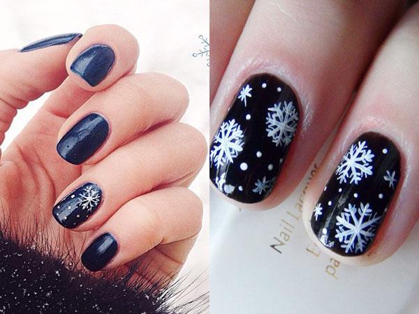Черные ногти на Новый год, украшенные стразами, камнями, смотрятся поистине богато. Матовая основа — то, что нужно для шикарного маникюра. Не менее ярко, молодежно смотрятся бело-голубые объемные снежинки.
