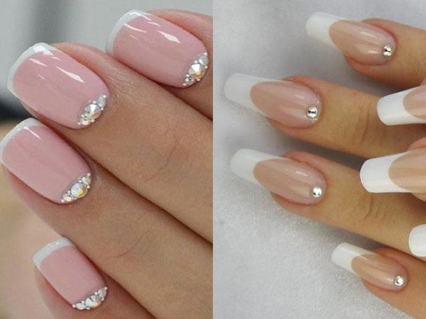 Френч — классический вид маникюра. Подойдет техника всем без исключения, выглядит изящно. Украсить белоснежные кончики ногтей можно камушками, художественной росписью или узором из красивых камушков, страз. Ажурная роспись на ногтях в сочетании с основой пастельных оттенков выглядит очень чувственно.