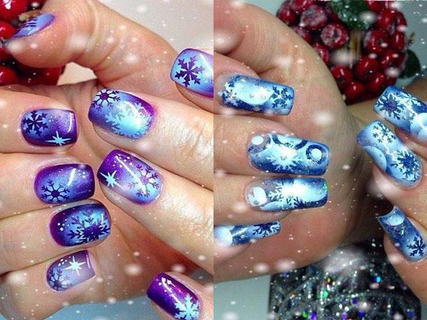 Аэрография на ногтях — тренд 2019 года. Плавные переход от одного оттенка к другому выглядит воздушно и гармонично. Зимний пейзаж, небесная лазурь, снежное небо — достойный вариант для новогоднего праздника.
