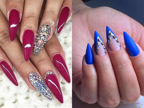 Острые ноготки на Новый год можно окрасить в яркие тона, с золотистым орнаментом, камушком, глиттером.