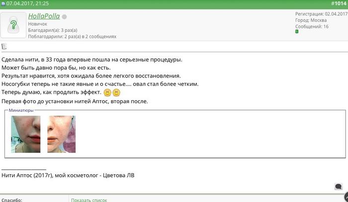 Пациенты положительно отзываются о продукции Аптос. Операция дает ожидаемый эффект лифтинга. Лицо выглядит подтянутым, становится моложе, результат продолжительный. Многие пациенты считают другие безоперационные методики малоэффективными. Отрицательные мнения встречаются редко.