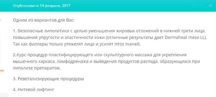 Пользователь пишет о хорошем результате подтяжки лица и устранении второго подбородка, постепенном нарастающем эффекте.