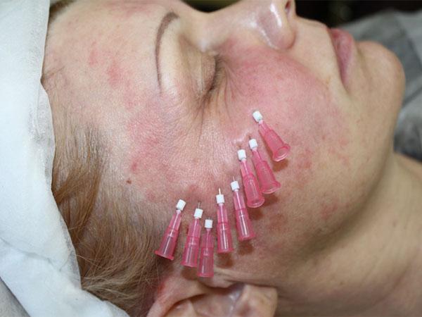- Места проколов обрабатываются антисептическим раствором. Для ускорения заживления наносится успокаивающий крем.