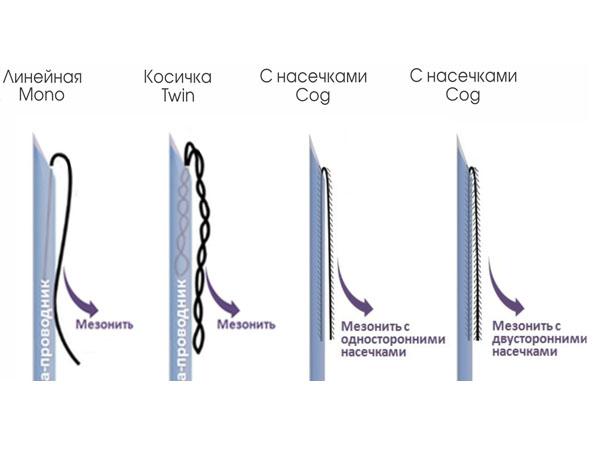 Нити Aptos: Эти нити обеспечивают наиболее длительный результат (18–24 месяца) благодаря уникальному сочетанию материалов (PLA, PCL) и конструкции с насечками, которая физически приподнимает и фиксирует провисающие ткани.