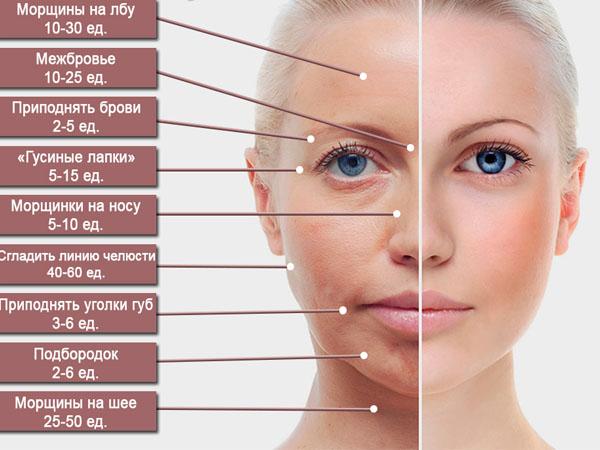 При определении дозировки врач ориентируется на максимальное количество единиц, принятое для определенной области введения. Минимальное воздействие осуществляют в области носа, для поднятия бровей. Достаточно 5 единиц Ксеомина. Для коррекции зоны подбородка, губ достаточно 6 единиц препарата. Для крупных областей существуют ограничения на введение ботокса: