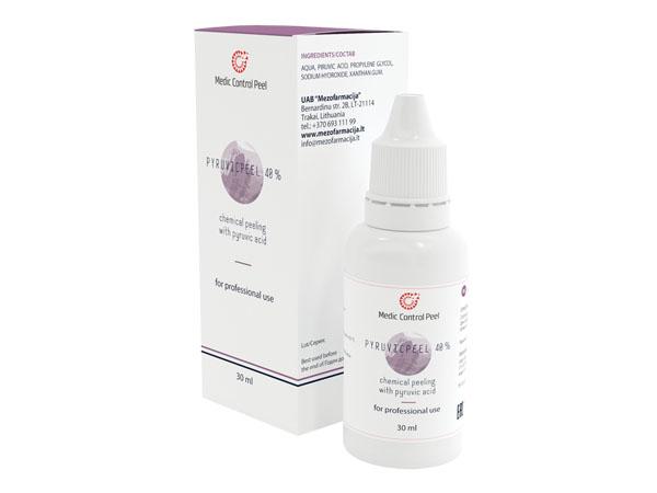 В PYRUVICPEEL 40% главным ингредиентом является пировиноградная кислота, отличительной особенностью которой признана большая проникаемость в слои дермы. Прописывается косметологам в таких случаях, как темные круги под глазами, морщины, стареющая или проблемная кожа, себорея. Наносится быстрыми движениями с помощью ватных дисков.