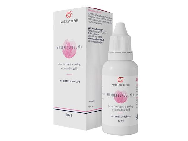В состав MANDELICPEEL 40% входит миндальная кислота, которая признана самым лучшим и эффективным элементом в лечении угревой сыпи и обладает бактерицидным действием. Наносится кисточкой на кожу в течение 1–5 минут. Сигналом для прекращения служит появление красноты.