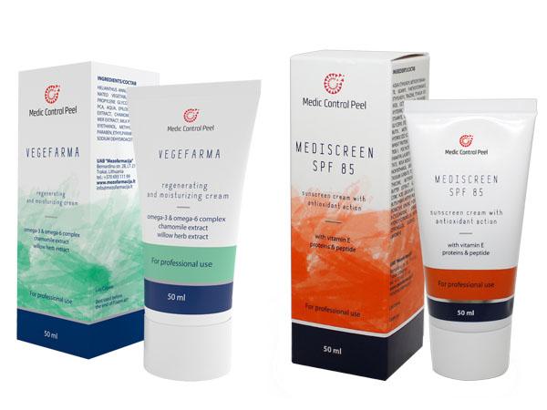 В постпилинговый период прописывают увлажняющей крем Vegefarma или Vegelip в зависимости от типа кожи и солнцезащитный MediScreen.