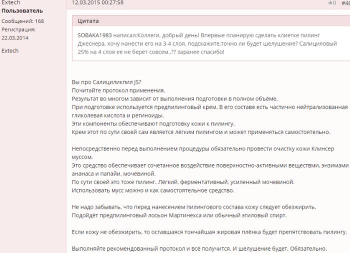 Мнений о компании Мартинекс и ее пилингах достаточно много в интернете. Например, один из пользователей форума считает, что Джесснер SALICYLICPEEL является одним из лучших. Отсутствуют побочные эффекты и легкость в использовании.