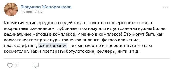 Врачи уверены в эффективности положительного действия кислорода на кожу. Методику предлагают часто, но в большинстве случаев для улучшения качества кожи, с целью борьбы с пигментными пятнами, акне, темными кругами. Для достижения омоложения результативность озонотерапии считается невысокой. Врачи предлагают вариант для поддержки общего состояния.