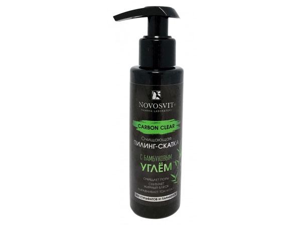 - Очищающая скатка Carbon clear с бамбуковым углем. За счет этого компонента, а также фруктовых экстрактов скатка очищает поры и выравнивает и улучшает оттенок кожного покрова. Адсорбирует излишки сальных выделений, устраняет жирный блеск. Как и гиалуроновая скатка, тоже имеет гелевую текстуру, но черного, угольного цвета. Деликатно отшелушивает, потому что не содержит абразивных частичек. Флакон оснащен помпой.