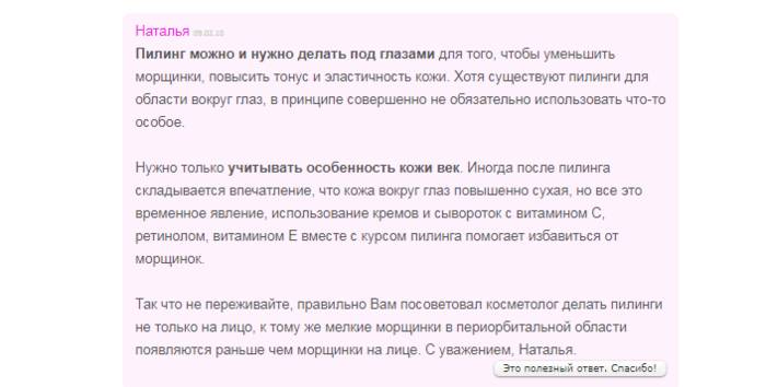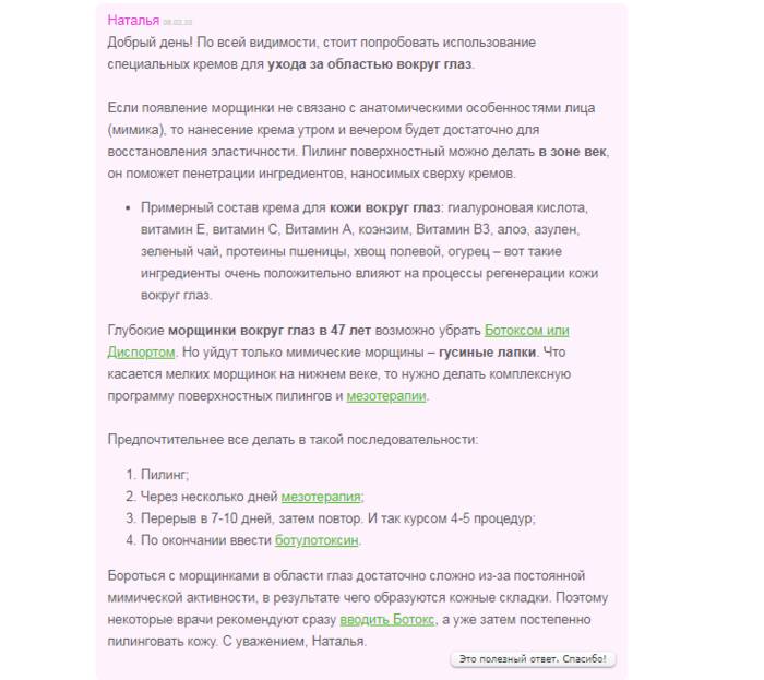 Специалисты считают, что после 45 лет чистка устраняет только мелкие морщинки на нижнем веке, с глубокими морщинами лучше справляется Ботокс.