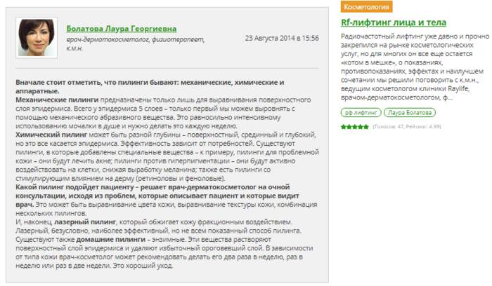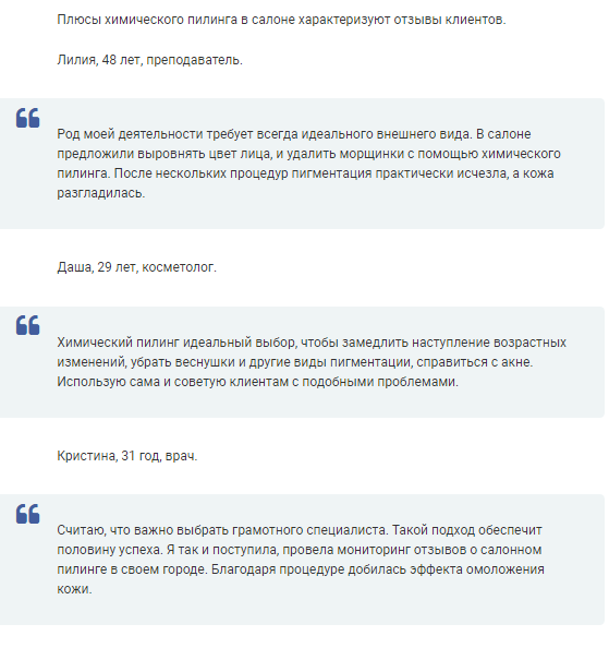 Пациентки считают химический пилинг действенным и доступным при появлении первых возрастных изменений. По их мнению, правильный выбор специалиста — это половина успеха.
