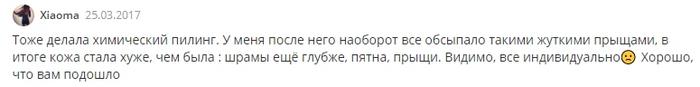 Но встречаются и негативные отзывы после проведения пилинга. Участник пишет об обострении угревой болезни, ухудшении общего состояния кожи, появлении рубцов, шрамов, пятен.