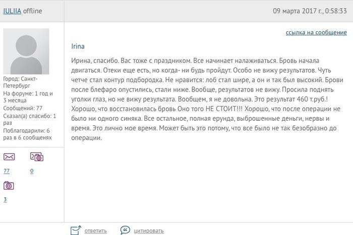 Пациентка опечалена мучительным периодом восстановления, жалеет потраченных денег.