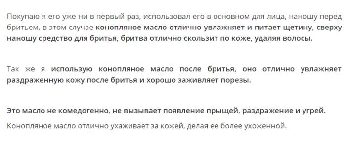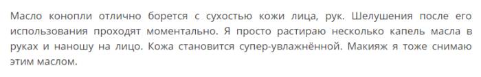 Конопляное масло прекрасно увлажняет кожу, буквально запечатывая влагу в ней. Благодаря лифтинг-эффекту косметические средства с коноплей подтягивают кожу лица и помогают бороться с возрастными изменениями. Масло из семян конопли не оставляет на поверхности кожи жирных следов.