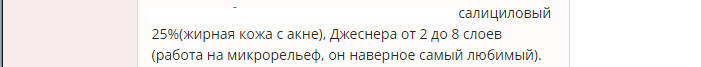 Если взглянуть на отзывы косметологов, то этот врач предпочитает 25% раствор для борьбы с жирной кожей и акне, а пилинг Джесснера у нее числится в фаворитах, когда нужно комплексно воздействовать на микрорельеф.