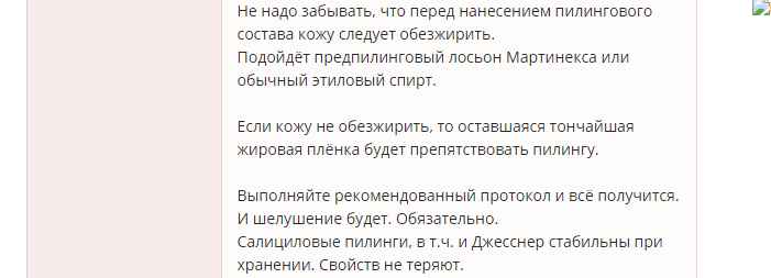 О том, как избежать ошибок при нанесении салицилового состава, рассказывает косметолог в этом отзыве. Говорит, что важно обезжирить кожу лосьоном или обычным спиртом. В противном случае естественная жировая пленка будет препятствовать проникновению пилинга. Также отмечает, что салициловый и пилинг Джесснера не теряют своих свойств при хранении.