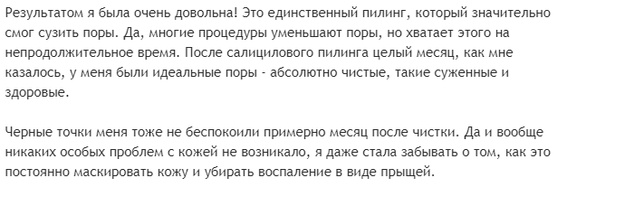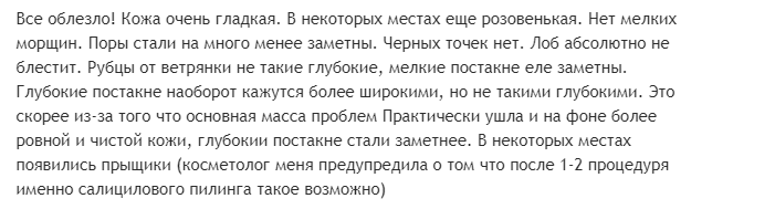 Полностью довольна последствиям чистки с салициловой кислотой следующая пациентка. Рассказывает, что это оказался единственный пилинг, который помог эффективно сузить поры надолго. Были устранены черные точки и улучшилось общее состояние кожи. Отмечает, что результат держался около месяца, в течение которого не нуждалась даже в использовании маскирующей косметики и средств для устранения прыщей.