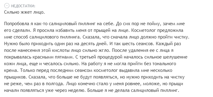 Считает бесполезной процедурой салициловый пилинг пациентка из этого отзыва. Сколько раз надо проходить по мнению косметолога, такой курс и прошла. Шелушение началось только после 3-го сеанса, каждый раз ощущала сильное жжение, а кожа покрывалась красными пятнами. Отмечает, что после полноценного курса лицо стало ровнее, но главную проблему — прыщи, пилинг не решил.