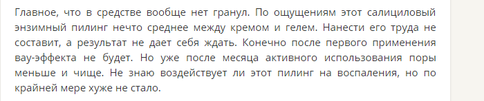 Опытом использования пилинга Стоппроблем делится пациентка в этом отзыве. Рассказывает, что после первого нанесения результаты не видны, но при регулярном применении улучшение состояния кожи наступает.