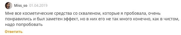 Сквалан чаще используют в составе косметики. Вариант вызывает положительные отзывы, хотя сказать, что оказало полученный эффект в таком случае невозможно. Чистое сквалановое масло обычно становится любимым продуктом для ухода за кожей.
