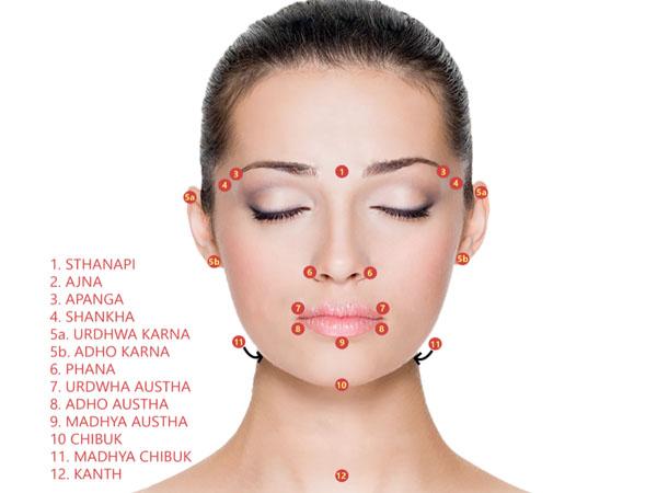 Аюрведическая техника основывается на знании основных марм — биологически активных точек, по которым циркулирует жизненная энергия. Осуществляется круговыми движениями по и против часовой стрелки. Воздействие по часовой стрелке помогает повысить энергетический потенциал, запустить процессы омоложения. Приемы против часовой стрелки избавляют от негатива, расслабляют мышечные волокна, разглаживают морщины.