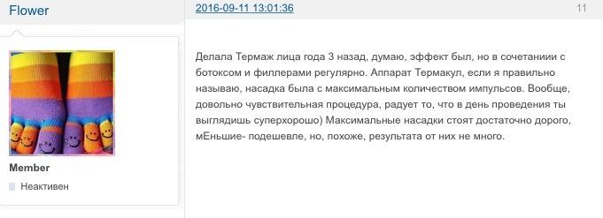 Клиенты косметологов не высказывают восторженных отзывов о термаже. Результат достигается не сразу, возможны осложнения, трудности с дальнейшей заботой о внешности. Пациенты часто применяют несколько методов коррекции внешности, после термажа проводят другие процедуры.