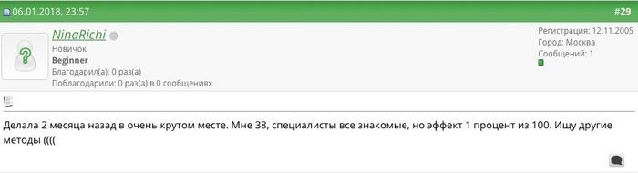 Пациентка положительно оценивает результат манипуляции, но конечный эффект достигается в сочетании с другими методиками антивозрастной коррекции.