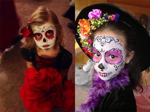 Грим в мексиканском стиле более сложный, требует симметричного исполнения. Ажурные узоры на осветленной коже выполняются синими, красными, малиновыми и другими тонами. Обратите внимание, рот изображают так, словно он зашит черной нитью.