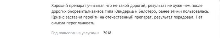 Автор этого отзыва осталась довольна биоревитализантом REVI. По мнению 33-летней женщины, кожа становится более увлажненной, улучшается цвет лица.