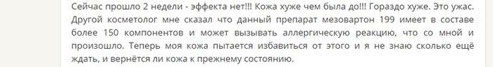 Эта женщина (возраст 40 лет), наоборот, осталась недовольна препаратом с пептидами Meso-Wharton P199. Причем процедуру она выполняла в клинике с хорошей репутацией. Врач соблюдала все меры предосторожности, но видимо, не предупредила пациентку о возможных аллергических реакциях.